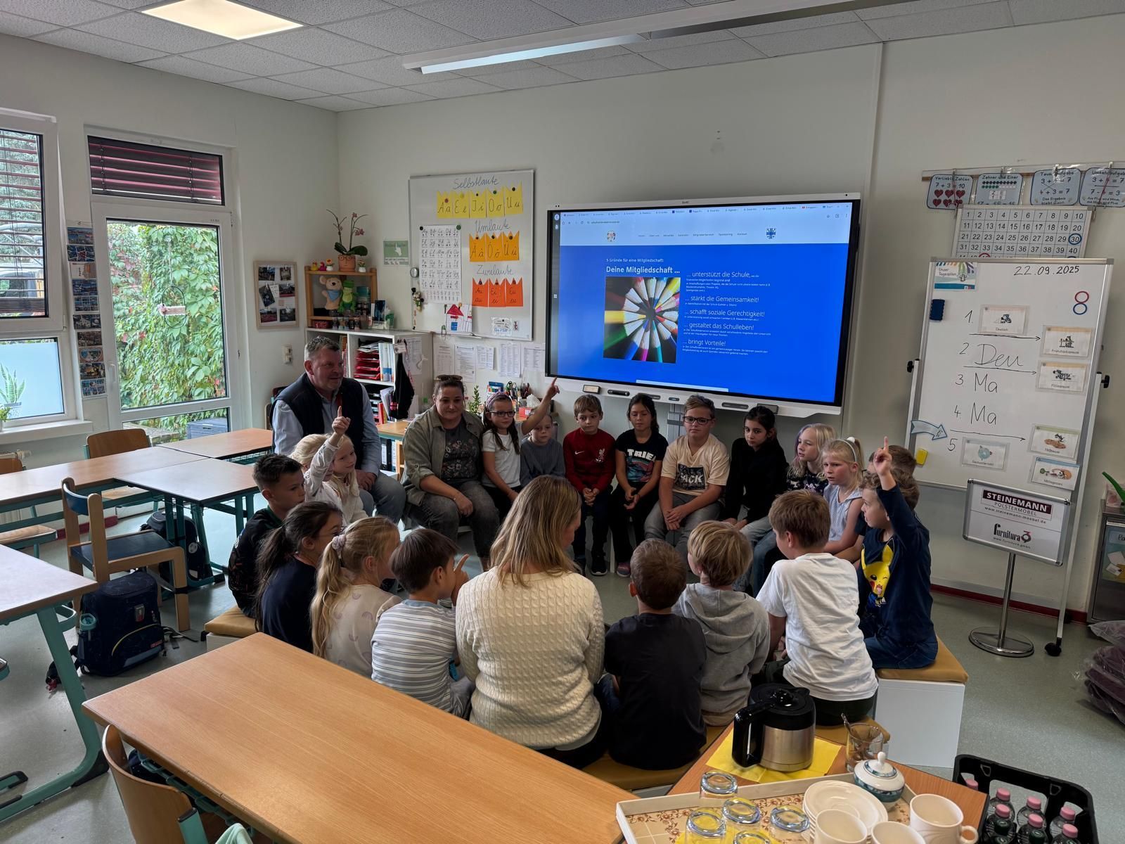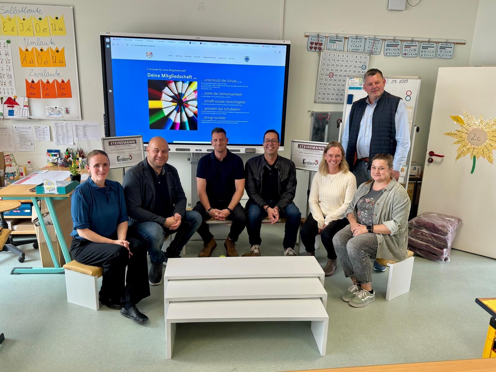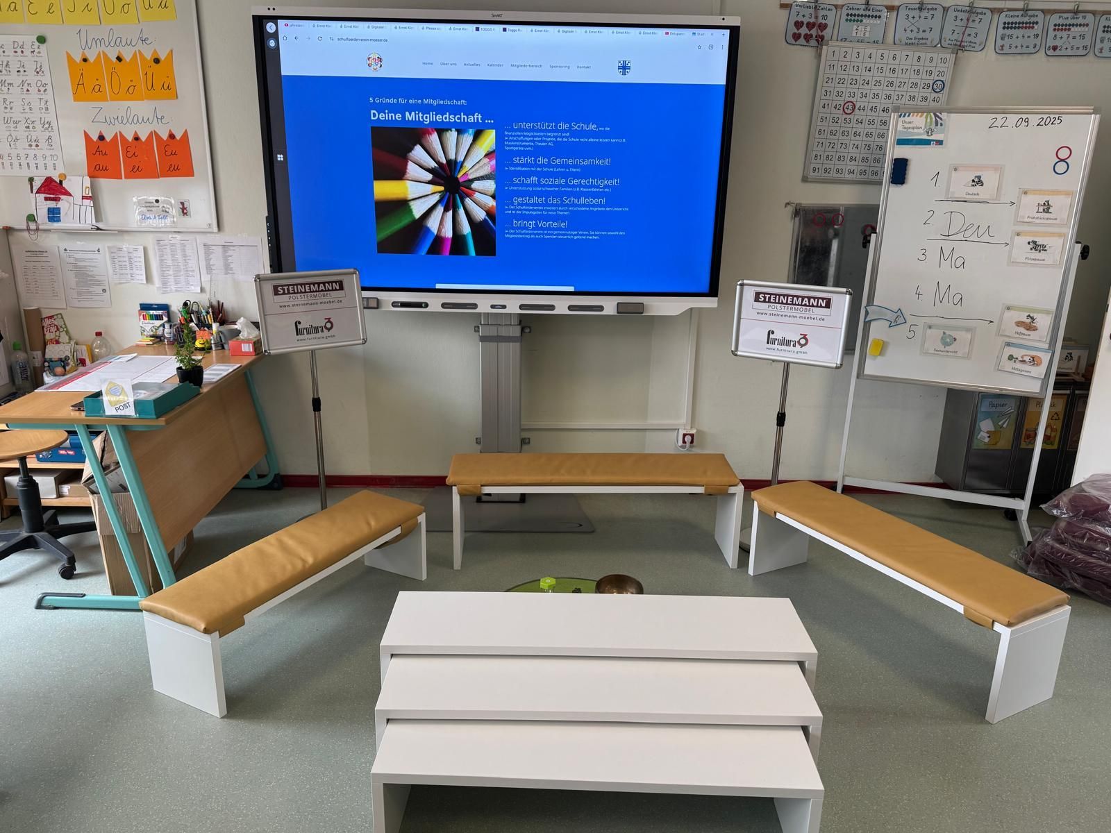 Am 22.09.2025 übergab der Schulförderverein der Grundschule Möser e.V., mit den gewonnenen Sponsoren „Steinemann Polstermöbel aus Wolmirstedt" und „furnitura39 aus Magdeburg", die Stapelbänke.