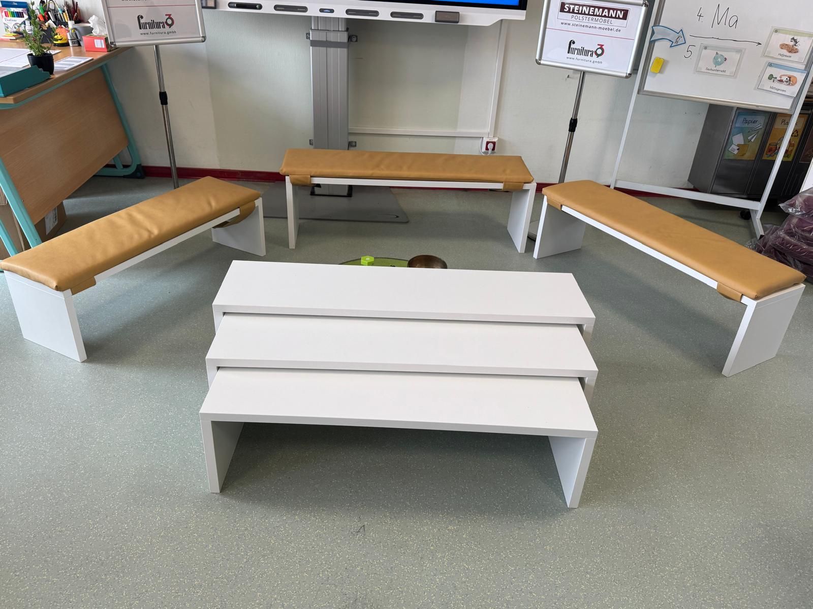 Die Bänke sollen multifunktional nutzbar sein: als Klassen-internes Lernmöbel, als Sitzgelegenheit für kurze Lern-Einheiten, als Gruppentisch in Partnerschafts- oder Kleingruppenarbeit sowie als ergänzender Sitzplatz bei Projekten.
